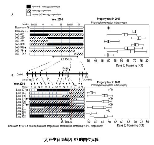 大豆分子設計育種重點實驗室夏正俊研究員及其合作者,歷經九年,通過圖位克隆法成功地破譯大豆光周期反應的中樞調節基因E1,并對其進行了功能驗證。研究結果表明E1基因是豆科作物特有的轉錄因子,揭示了大豆具有獨特的光周期調控開花網絡。主要研究結果發表在2012年Proc Natl Acad Sci USA 109(32): E2155–E2164 (doi:10.1073/pnas.1117982109),被國內外大豆研究者及育種家評論為在大豆光周期反應研究中一個重要里程碑。