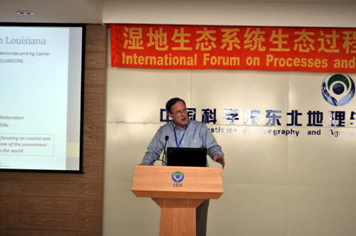 7月29日上午進(jìn)行了會(huì)議開幕式和大會(huì)學(xué)術(shù)報(bào)告。開幕式由中國(guó)科學(xué)院濕地生態(tài)與環(huán)境重點(diǎn)實(shí)驗(yàn)室呂憲國(guó)主任主持,我所劉興土院士、何興元所長(zhǎng)分別致辭。中國(guó)科學(xué)院濕地研究中心副主任劉興土院士簡(jiǎn)要介紹了當(dāng)前濕地學(xué)科的進(jìn)展和存在的關(guān)鍵科學(xué)問題,并對(duì)于濕地學(xué)科寄予了美好的期望,希望借此次國(guó)際會(huì)議,世界各地的科技工作者充分交流,共同為保護(hù)濕地、利用濕地做出應(yīng)有的貢獻(xiàn)。何興元所長(zhǎng)代表我所對(duì)所有參會(huì)人員的到來表示歡迎,希望借本次會(huì)議增進(jìn)濕地學(xué)科的國(guó)際合作與交流,他還簡(jiǎn)要介紹了我所的基本情況及我所濕地學(xué)科的人員情況、科研成果及發(fā)展?fàn)顩r等。應(yīng)會(huì)議邀請(qǐng),國(guó)家林業(yè)局濕地保護(hù)管理中心馬廣仁主任、吉林省林業(yè)廳喬恒副廳長(zhǎng)、劉興土院士、路易斯安那州立大學(xué)海岸環(huán)境學(xué)院Christopher F D'Elia院長(zhǎng)分別以“濕地生態(tài)系統(tǒng)保護(hù)管理”“吉林省濕地保護(hù)與資源綜合利用”“退化濕地恢復(fù)—葦蟹(魚)稻生態(tài)恢復(fù)工程”“路易斯安那州濕地科學(xué)與教育”為題作了大會(huì)主題報(bào)告。
