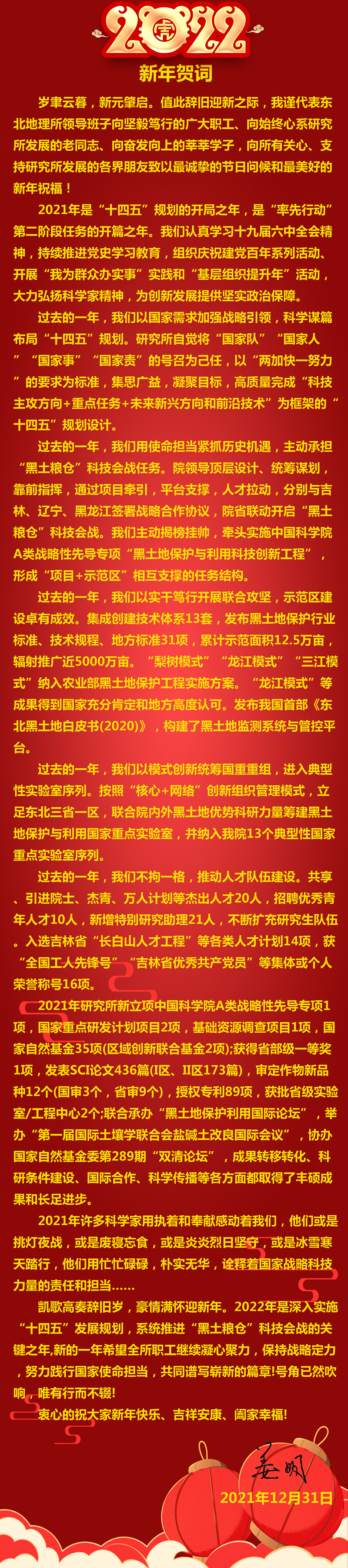 60年的耕耘,東北地理所取得了累累的科研碩果。創建了我國濕地學科理論體系,揭示我國濕地形成與發育規律、土壤關鍵過程與生態功能,研發退化沼澤近自然綜合恢復關鍵技術、濕地植被快速恢復技術和濕地葦-蟹/魚-稻復合生態模式。闡明了黑土演化過程與驅動機制,揭示了黑土退化特征和肥力調控機理,研發了黑土地肥沃耕層構建關鍵技術、作物高光效新型種植模式、侵蝕黑土綜合防治技術、合作研發了“梨樹模式”等黑土保護與利用關鍵核心技術,支撐“黑土糧倉”科技會戰。首次克隆了控制大豆開花期的最大位點基因E1以及控制大豆長青春期性狀的經典基因J,在國際上率先建立大豆分子設計育種理論體系和最大容量的大豆突變體庫;研發和...