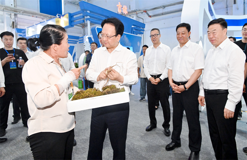 7月22日,省委書(shū)記景俊海,省委副書(shū)記、省長(zhǎng)胡玉亭在農(nóng)產(chǎn)品展示區(qū)與參展商親切交流。鄒乃碩 攝