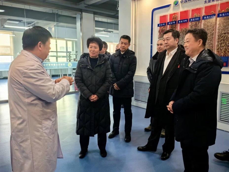在種質(zhì)資源樓,吳海英調(diào)研了大豆分子設(shè)計育種重點實驗室,現(xiàn)場查看了大豆基因突變體庫、大豆分子設(shè)計育種技術(shù)體系、高通量作物表型組分析系統(tǒng)及“東生”系列大豆新品種選育與轉(zhuǎn)化工作。