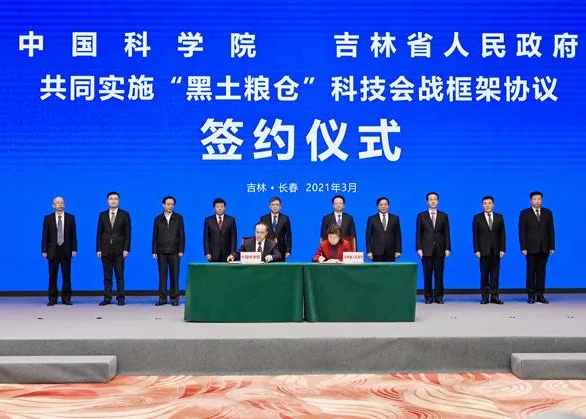 3月29日,中國科學(xué)院和吉林省人民政府在長(zhǎng)春共同啟動(dòng)“黑土糧倉”科技會(huì)戰(zhàn)。中科院院長(zhǎng)、黨組書記侯建國,吉林省委書記景俊海,吉林省委副書記、省長(zhǎng)韓俊等出席活動(dòng)。中科院副院長(zhǎng)張濤和吉林省副省長(zhǎng)李悅代表雙方簽署了科技會(huì)戰(zhàn)框架協(xié)議。