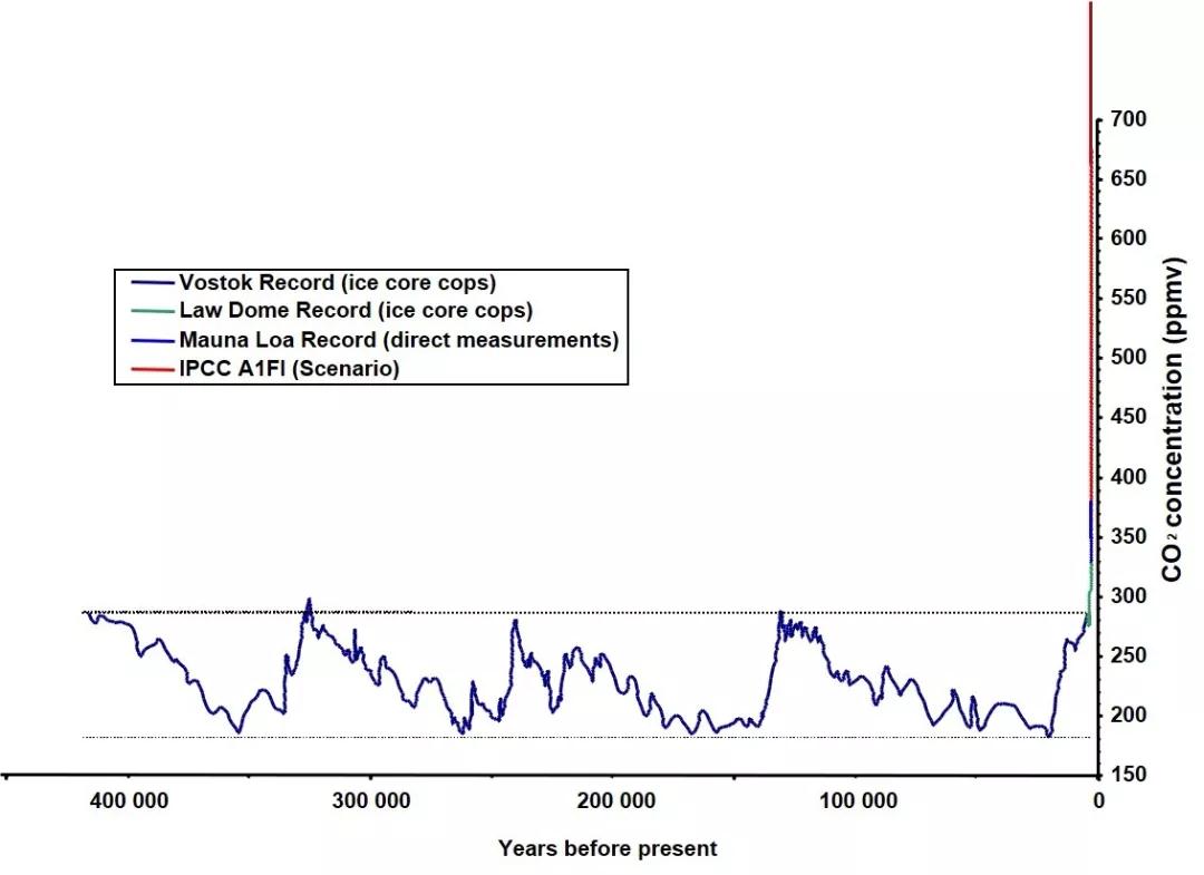 全球CO2濃度變化趨勢(引自德國霍恩海姆大學(xué)Petra Hogy)