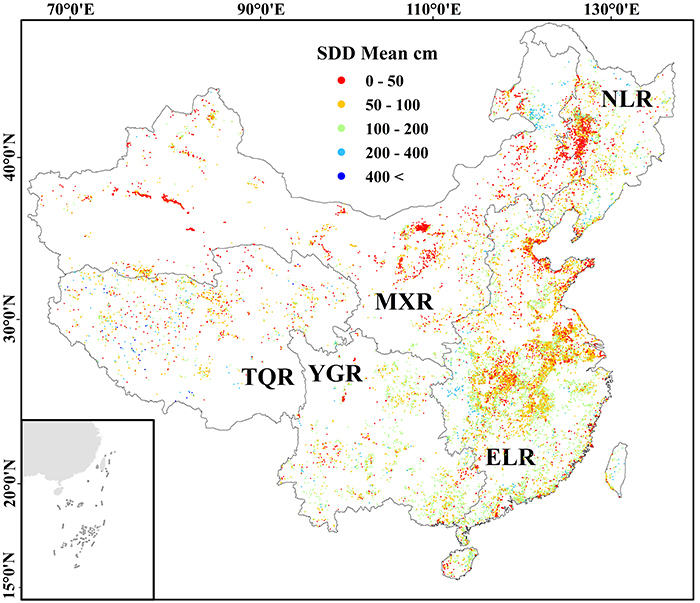 中國科學院東北地理與農業生態研究所水環境遙感學科組的科研人員歷時6年,對全國湖泊水體SD(湖泊透明度)進行了34次野外調查分析,基于實測數據與Landsat OLI遙感數據,構建了一種新的基于紅藍波段比值的估算SD遙感模型,首次實現了30米分辨率全國湖泊SD遙感反演。
