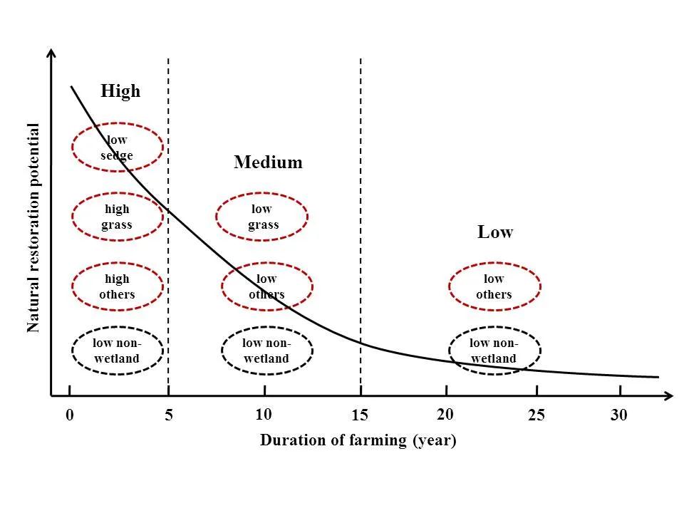 據此,提出基于種源限制的沼澤濕地植被恢復的開墾年限閾值(15-20年),并結合植物功能群變化對退耕地的沼澤濕地植被自然恢復潛力進行“高—中—低”三級劃分,為退化沼澤濕地植被恢復技術優化和物種選擇提供科學依據。目前該成果已被國內外多家著名的濕地生態恢復科研團隊采用,作為制定流域尺度濕地生態恢復方案的關鍵參數。