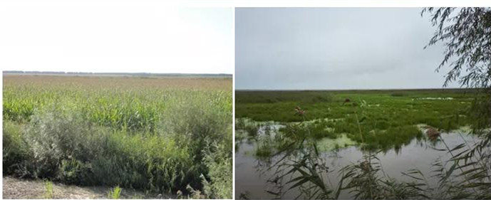 退耕還濕地沼澤濕地植被恢復效果(左圖:恢復前;右圖:恢復后)