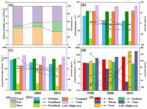 1990~2015年三江平原生態系統服務變化:不同等級生境適宜性面積(a)、主要土地覆被類型的水源涵養(b)、主要土地覆被類型的生態系統碳儲量(c)、糧食產量(d) 圖片來源:中國科學院東北地理與農業生態研究所