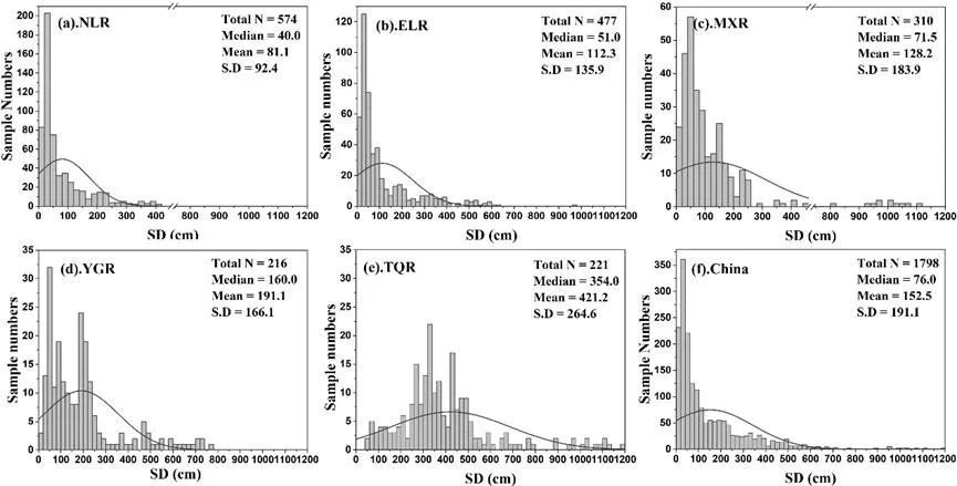 中國科學院東北地理與農業生態研究所水環境遙感研究團隊充分考慮這些因素,對全國湖泊水體SD進行了歷時6年共計34次野外調查分析,共采集了200余個湖泊的野外數據。以野外采樣日期與過境Landsat 8影像相差7天為標準,篩選得到了1792個星地匹配數據。最終基于實測數據與Landsat OLI遙感數據,構建了一種新的基于紅藍波段比值的中國湖泊透明度遙感估算模型,通過覆蓋整個中國的大樣本星地匹配數據的參數化,模型的穩定性和魯棒性均得到了大幅度的提高。該算法結合GEE云平臺,基于2016年中國夏秋季可用Landsat影像,得到了該年中國0.1 km2以上湖泊透明度反演結果,首次實現了30米分辨率全國湖泊SD遙感反演(圖2)。