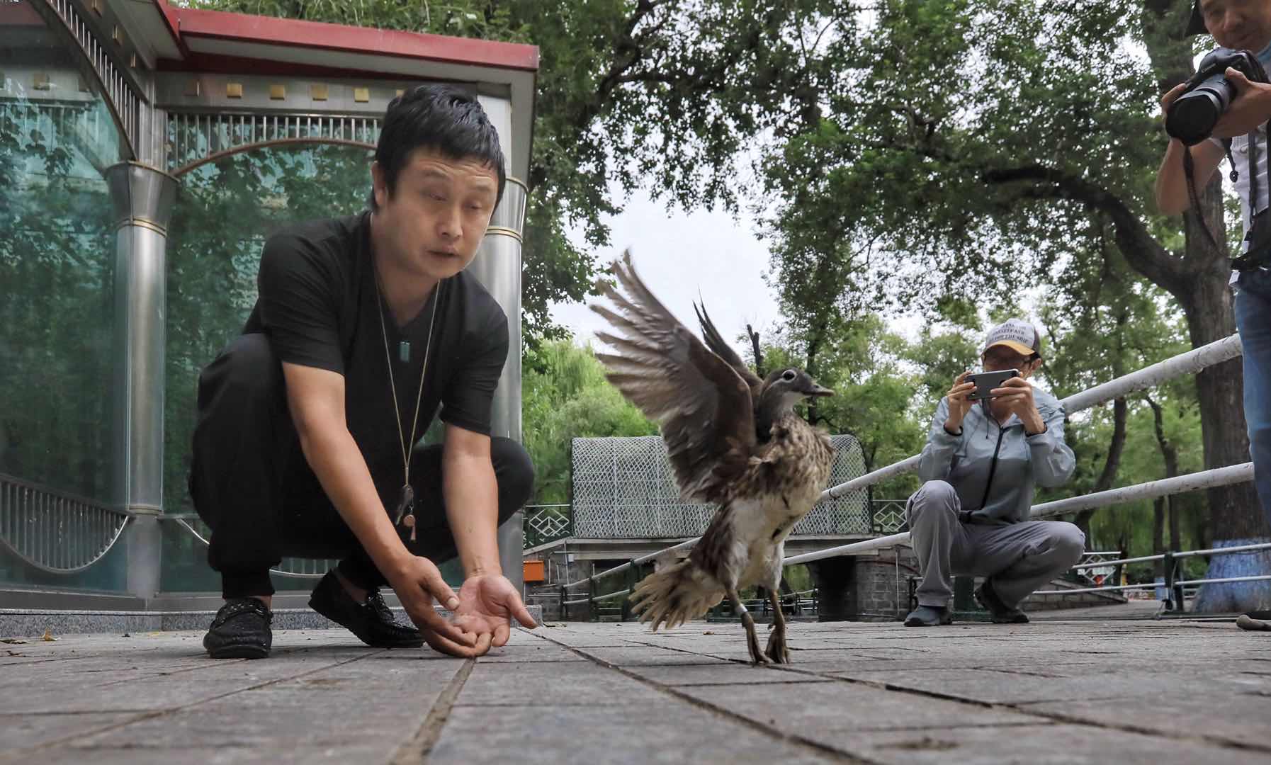 今夏,哈爾濱市兆麟公園內(nèi),南遷而來的鴛鴦共跳巢20窩,出生幼仔185只,創(chuàng)造了歷史紀錄。為了配合東北濕地鳥類監(jiān)測項目,弄清兆麟公園鴛鴦的遷徙情況,8月7日,中科院東北地理與農(nóng)業(yè)生態(tài)研究所的副研究員王強與車春虎等鴛鴦志愿者一道,給南遷而來的鴛鴦戴上鳥類衛(wèi)星追蹤器。在戴追蹤器之前,王強與車春虎給鴛鴦測量了體重、身高、翅長等基本數(shù)據(jù)。
