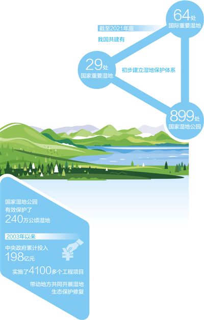 近年來,我國大力推進濕地保護修復,先后出臺《關于加強濕地保護管理的通知》《濕地保護管理規定》《濕地保護修復制度方案》,28個省份出臺省級濕地保護法規或規章。截至2021年底,我國共建有64處國際重要濕地、29處國家重要濕地、899處國家濕地公園,初步建立濕地保護體系。但與此同時,隨著經濟快速發展,保護和利用的矛盾日益凸顯。“濕地遭受非法侵占、圍墾、污染等現象時有發生,保護形勢依然嚴峻?!眹伊謽I和草原局濕地管理司司長吳志民表示。