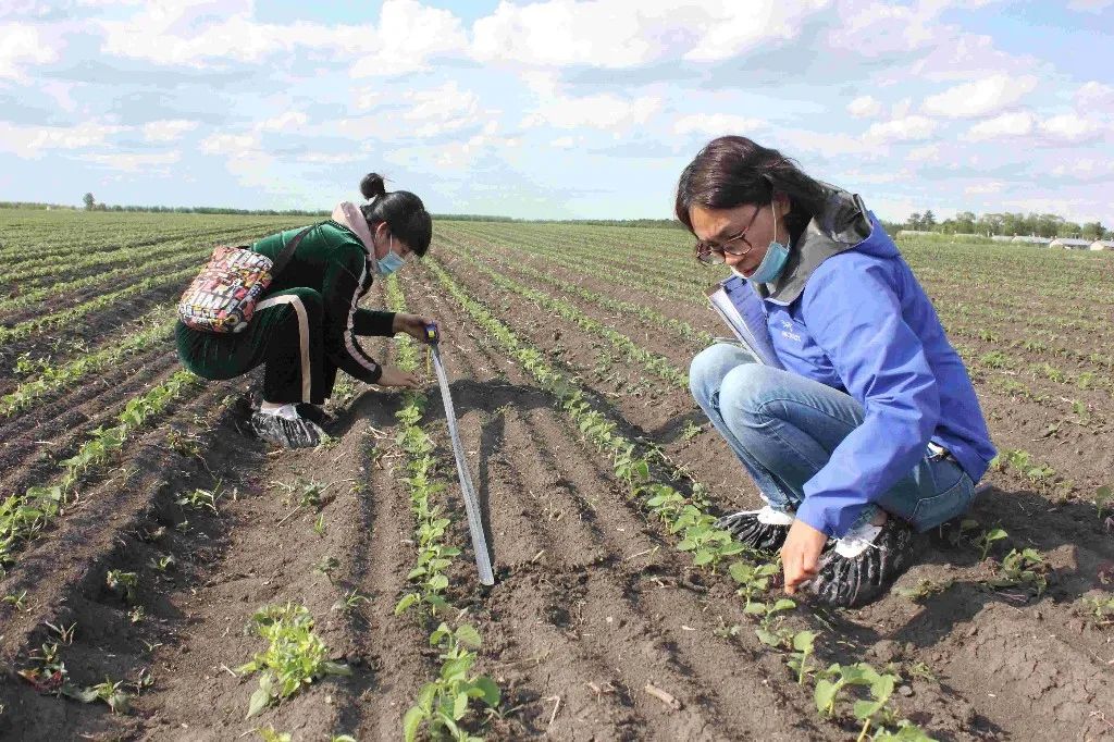 鄒文秀(右)在田間調(diào)查大豆豆苗長勢。受訪者供圖