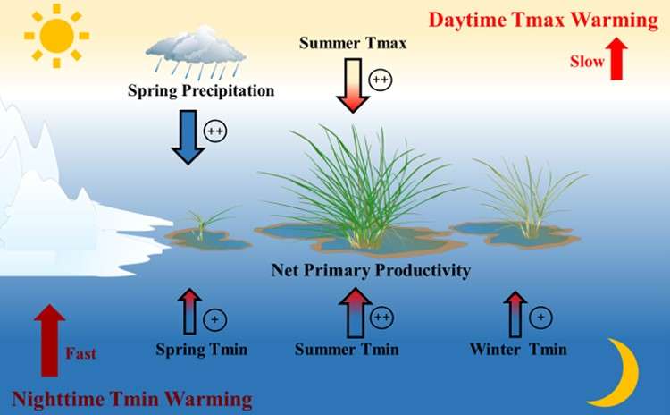 研究發(fā)現(xiàn),白天和夜晚升溫對青藏高原沼澤濕地植被NPP具有不對稱的影響。冬季和春季夜晚升溫能夠通過減少凍害的發(fā)生,在一定程度上增加青藏高原沼澤濕地植被NPP。在夏季,白天和夜晚升溫均會導(dǎo)致植被NPP顯著升高。