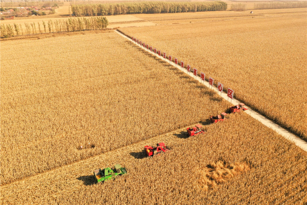 在吉林省梨樹縣國家百萬畝綠色食品原料(玉米)標準化生產(chǎn)基地核心示范區(qū),農(nóng)民駕駛農(nóng)機進行秋收作業(yè)(無人機照片,2021年10月23日攝)。新華社記者 張楠 攝