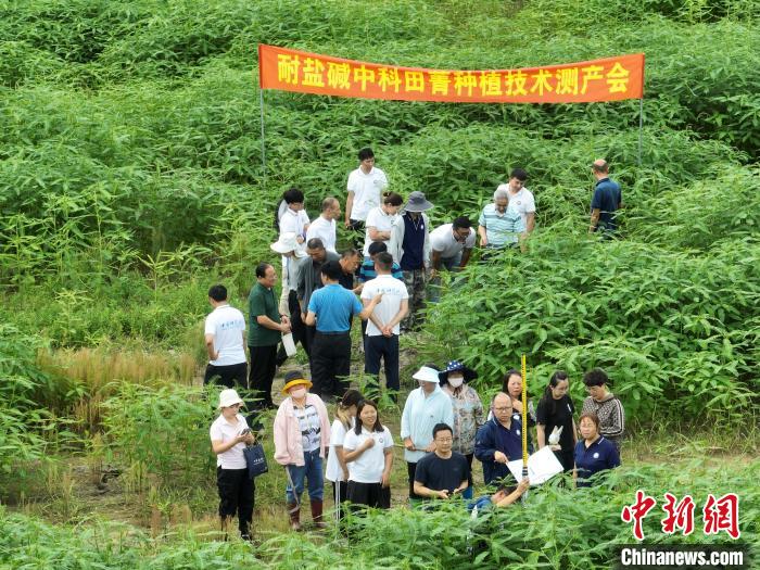 此次測產(chǎn)標(biāo)志著由中國科學(xué)院遺傳與發(fā)育生物學(xué)研究所曹曉風(fēng)院士團(tuán)隊(duì)選育的耐鹽堿、肥飼兼用型中科田菁品系在貧瘠的重度鹽堿地也能高產(chǎn)。