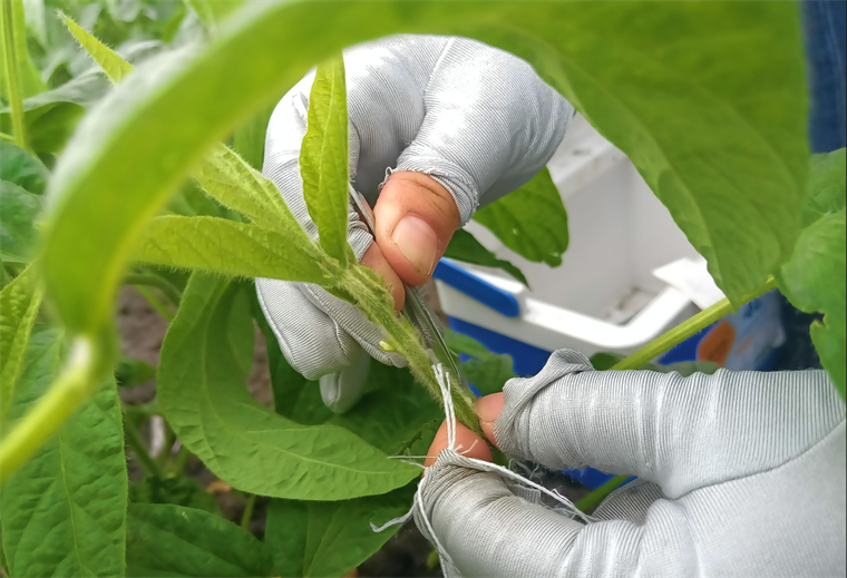 在中國科學院東北地理與農業生態研究所海倫農業生態實驗站的實驗田里,李艷華坐在自制的泡沫墊上,小心翼翼地將大豆花朵打開,與事先準備好的其他品種的大豆花朵結合。她邊操作邊向記者介紹,并不是每一朵花都能授粉,要找出大豆單株長勢好、且花的質量也好的才可以。花期不等人,一個組合授粉最好在一周左右內完成,每年做400個雜交組合,每個組合做近100個小花,這項工作的繁重可想而知。