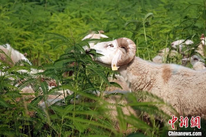 田菁驅動的鹽堿地改良與應用技術示范觀摩會現(xiàn)場,羊群享受田菁美味。中新網記者 孫自法 攝