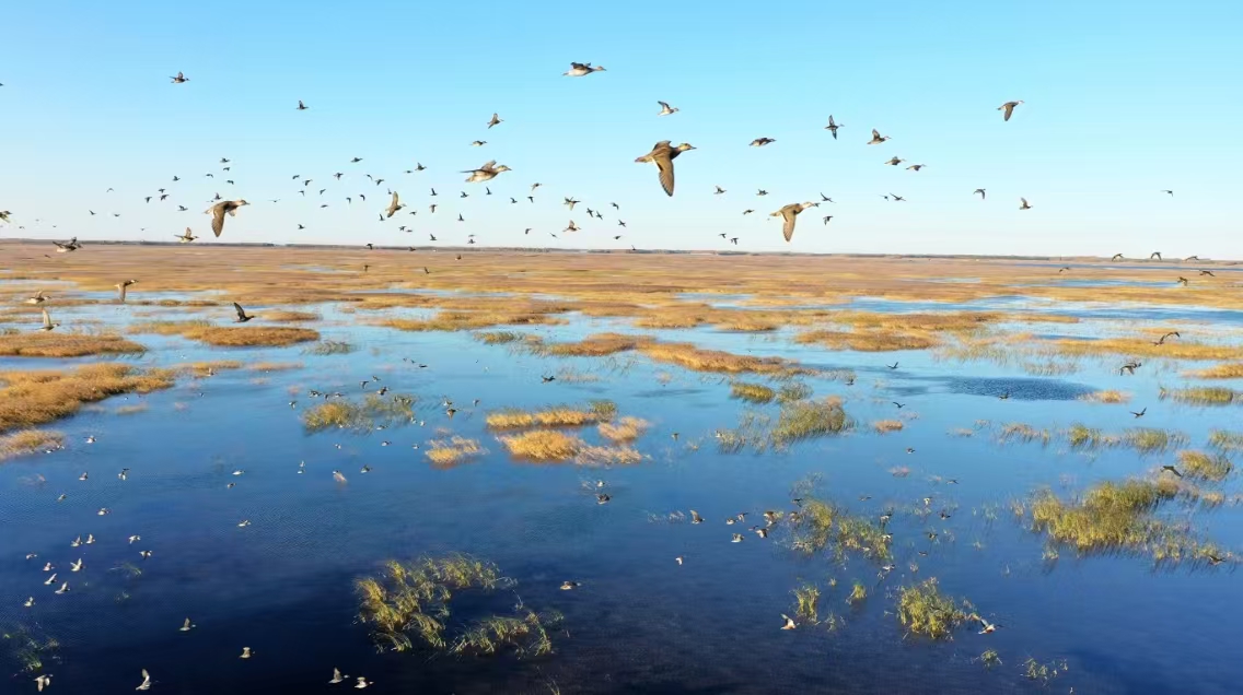 九月底,大安牛心套保國家濕地公園秋意綿延,連片葦花隨風翻起白色細浪,水清魚躍,群鳥翱翔,一眼望不盡的生態美景。