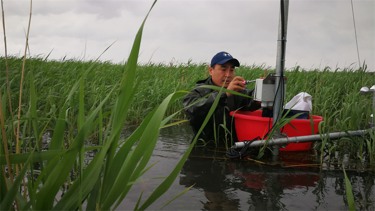 文波龍正在調試濕地生態特征和功能變化監測裝置