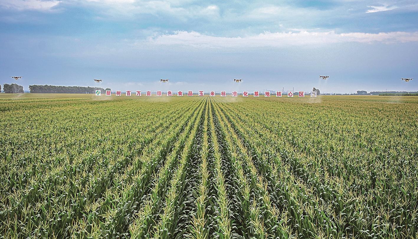 在梨樹縣國家百萬畝綠色食品原料(玉米)標準化生產基地核心示范區,工作人員開展植保無人機飛防作業。 本報記者 趙博 攝