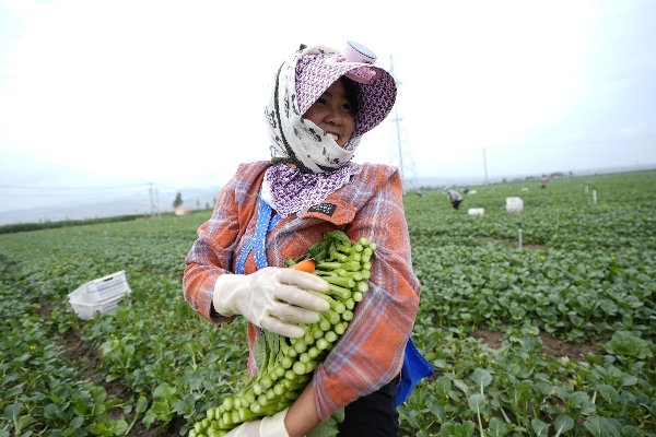工作人員在寧夏固原市原州區(qū)彭堡鎮(zhèn)采摘菜心。新華社記者王鵬攝