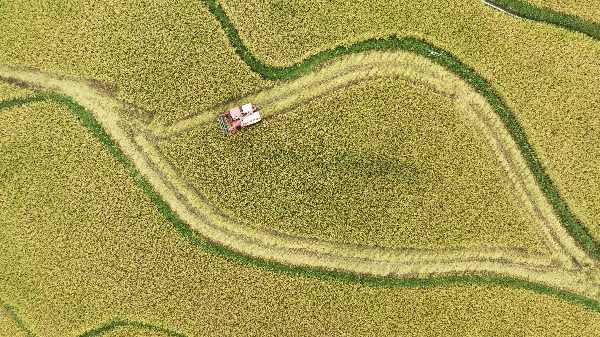 農(nóng)機(jī)手駕駛聯(lián)合收割機(jī)在貴州省綏陽縣旺草鎮(zhèn)收割水稻(無人機(jī)照片)。新華社發(fā)(李前勇攝)