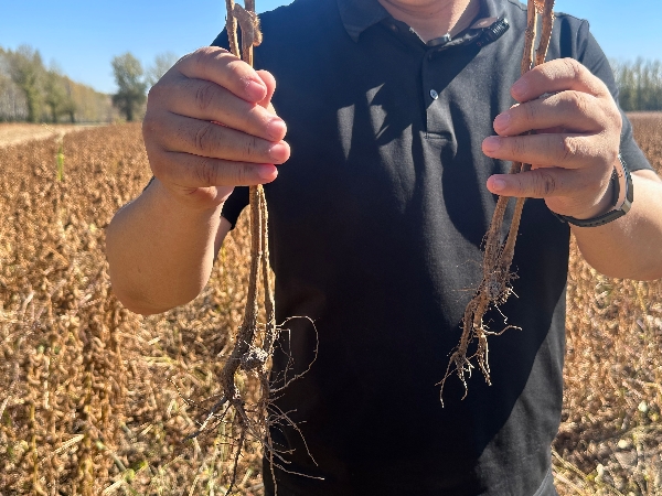 “這粒肥料的妙處在于既‘節本’又‘護土’,還能‘增產’,你看兩組田大豆的根系深度都不一樣,處理組大豆的根系更長。”東北農業大學資源與環境學院教授姜佰文解釋說,硅鈣鎂硫等中量元素,恰好補上了長期施用“老三樣”造成的土壤養分缺口,像給作物根系“搭了腳手架”,刺激根系發育的同時,還能增強作物抗病抗逆能力;而微生物與礦質元素的協同作用,不僅提高了肥料利用率,減少30%化肥用量,其保肥保墑的特性更讓板結的黑土地慢慢恢復“元氣”。