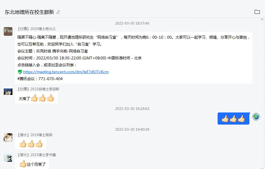 籌備組成員圍繞如何做好黨支部換屆準備工作、封閉期間如何營造學習氛圍、建立互助共享平臺、防火安全、疫情防控等內容開展充分討論。在討論過程中,李穎、苑春宇與同學們積極互動,充分交流,對大家的意見建議給予肯定,并將“網絡自習室”和“互助共享平臺”等相關工作落實到人,確保快速落地。