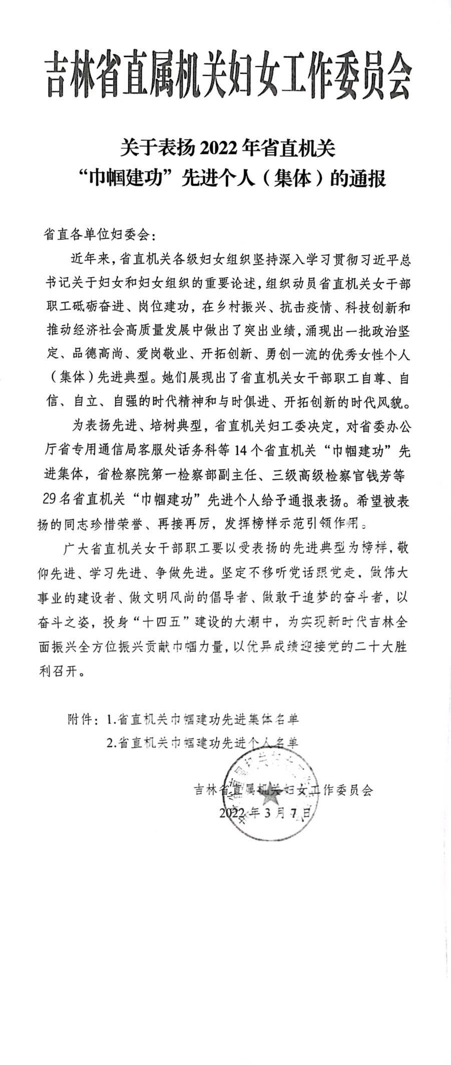 為表揚先進、培樹典型,省直機關婦工委印發《關于表揚2022年省直機關“巾幗建功”先進個人(集體)的通報》,對14個省直機關“巾幗建功”先進集體和29名省直機關“巾幗建功”先進個人給予通報表揚。東北地理與農業生態研究所黑土有機碳與保護性耕作學科組組長、黑土區農業生態重點實驗室副主任梁愛珍,榮獲2022年省直機關“巾幗建功”先進個人稱號。