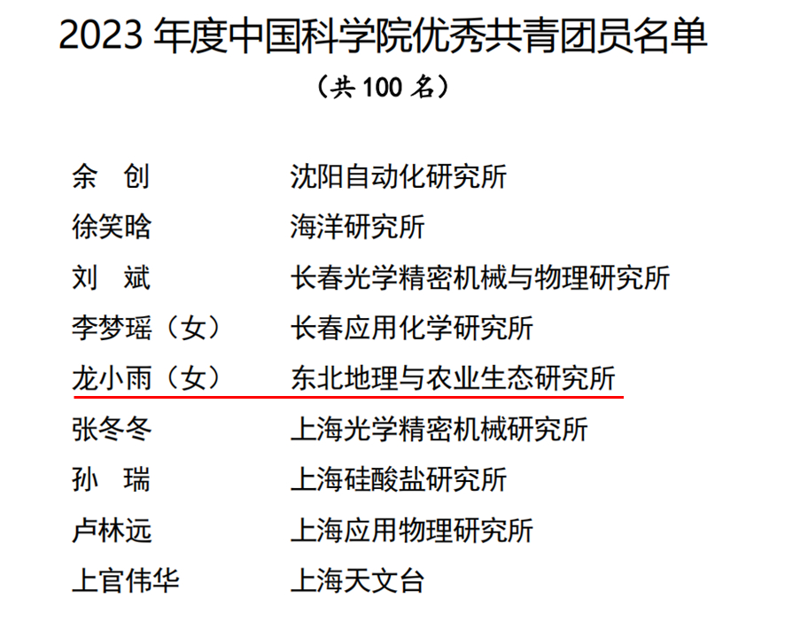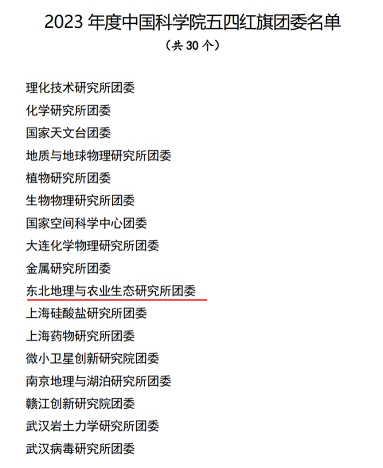 為表彰先進(jìn)、樹(shù)立典型,激勵(lì)團(tuán)青組織和廣大團(tuán)員、團(tuán)干部奮勇?tīng)?zhēng)先、再創(chuàng)佳績(jī)。近日,中國(guó)科學(xué)院團(tuán)委發(fā)文對(duì)30個(gè)五四紅旗團(tuán)委、30個(gè)五四紅旗團(tuán)支部、50名優(yōu)秀共青團(tuán)干部、100名優(yōu)秀團(tuán)員青年進(jìn)行表彰。中國(guó)科學(xué)院東北地理與農(nóng)業(yè)生態(tài)研究所團(tuán)委榮獲“2023年度五四紅旗團(tuán)委”稱(chēng)號(hào)、2023級(jí)博士研究生龍小雨榮獲“2023年度中國(guó)科學(xué)院優(yōu)秀共青團(tuán)員”稱(chēng)號(hào)。