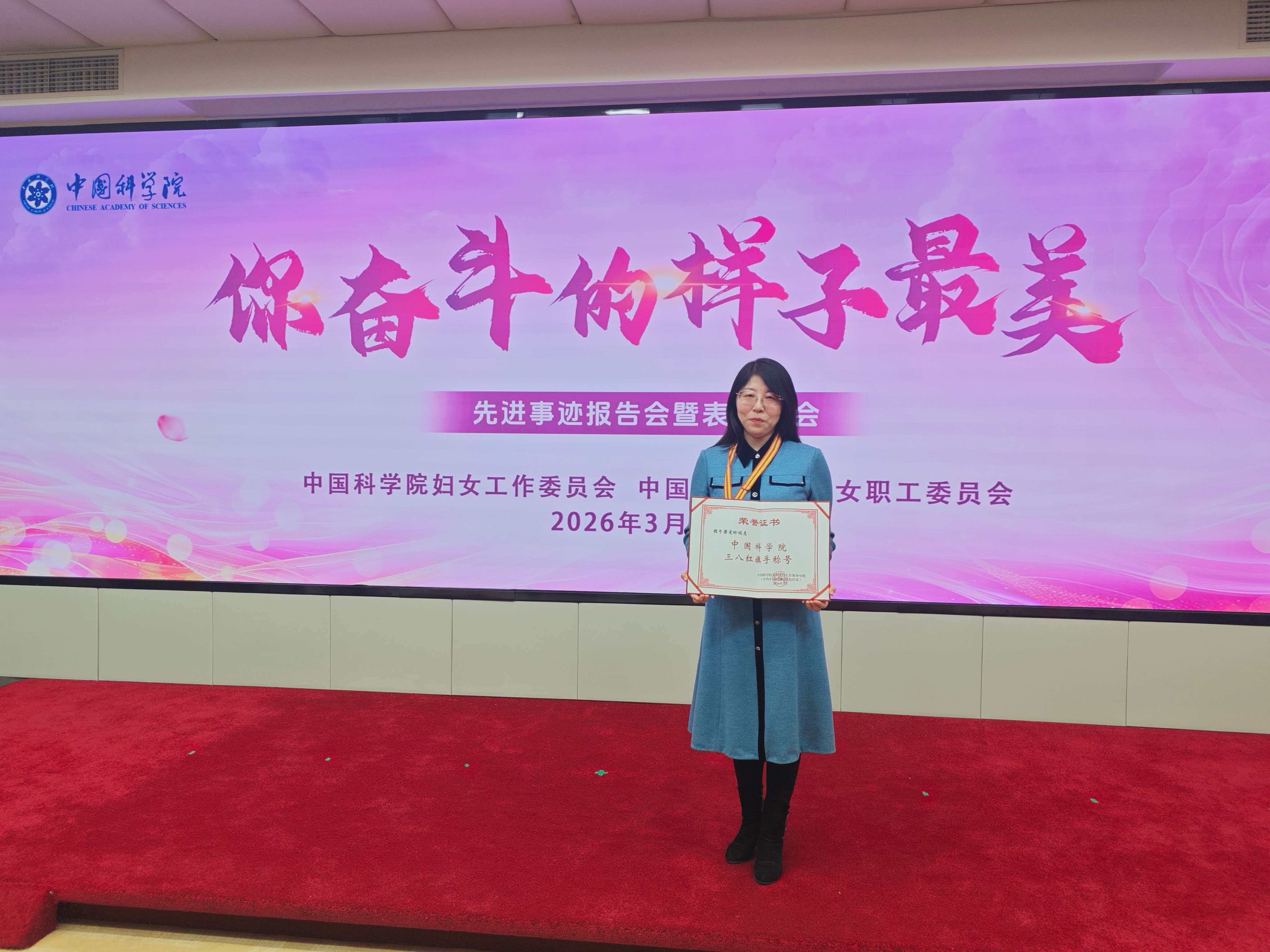 為選樹先進典型,激勵引領全院廣大女干部職工積極投身科技創(chuàng)新,努力為建設世界科技強國作出貢獻,在2026年“三八”國際勞動婦女節(jié)來臨之際,3月5日上午,中國科學院婦女工作委員會、中國科學院工會女職工委員會舉辦“你奮斗的樣子最美”先進事跡報告會暨表彰大會。大會表彰了15名“中國科學院三八紅旗手”和5個“中國科學院三八紅旗集體”。我所梁愛珍研究員榮獲第三屆“中國科學院三八紅旗手”榮譽稱號。
