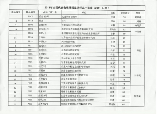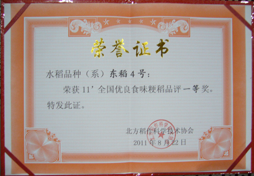 2011年8月21-24日,由北方稻作科學(xué)技術(shù)協(xié)會(huì)組織國(guó)內(nèi)外稻米品嘗專(zhuān)家20人,針對(duì)來(lái)自全國(guó)各地參評(píng)的優(yōu)良粳稻審定品種,從米飯的氣味(香氣),外觀(guān)結(jié)構(gòu)(米飯顏色、光澤、米粒完整性),適口性(粘性、軟硬度、彈性)和味道(滋味、純正性與持久性)四個(gè)方面進(jìn)行單項(xiàng)7個(gè)等級(jí)進(jìn)行評(píng)分,最后以綜合評(píng)分的平均值作為米飯食用品質(zhì)感官評(píng)比結(jié)果,按照事先確定好的綜合得分85以上為特等獎(jiǎng),80-85分為一等獎(jiǎng),75-80分為二等獎(jiǎng),70-75分為三等獎(jiǎng),65-70分為優(yōu)秀獎(jiǎng)的評(píng)選標(biāo)準(zhǔn)。經(jīng)過(guò)評(píng)委們一天認(rèn)真的品嘗,最終共評(píng)選出特等獎(jiǎng)1個(gè)(與日本越光品種同為88分),一等獎(jiǎng)2個(gè),二等獎(jiǎng)7個(gè),三等獎(jiǎng)5個(gè),優(yōu)秀獎(jiǎng)5個(gè)。我所培育的“東稻4號(hào)”水稻品種以80分的好成績(jī)獲得一等獎(jiǎng)。