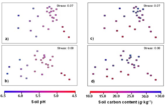 圖1 東北黑土農田細菌群落結構的NMDS分析。圖a和c及圖b和d是基于unweighted和weighted UniFrac群落分析結果