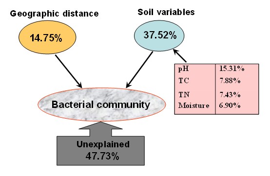 動植物在陸地生態(tài)系統(tǒng)中存在一定的地理分異規(guī)律。與動植物相比,對于陸地生態(tài)系統(tǒng)中數量巨大、種類多樣的土壤微生物而言,是否存在生物地理分布格局及其驅動因素是什么?是目前土壤學和微生物生態(tài)學研究的前沿科學問題。已有的研究結果表明,不同生態(tài)系統(tǒng)中的土壤微生物受到生物和非生物因素的雙重影響,群落結構多樣性及群落結構組成存在較大差異。在這些影響因素中土壤pH被普遍認為是制約土壤細菌群落結構變化的主要因素。值得指出的是,多數研究均是基于土壤pH值差異較大的不同原始土壤進行的,而對于同一種土壤類型,土壤pH值變化較小而其它土壤理化性質差異較大時,決定土壤微生物生物地理分布的因素是什么是一個值得探討的科學問題。