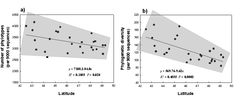 東北黑土是我國重要的土壤資源,在保障國家糧食安全和生態(tài)安全上具有重要地位。由于受氣候、開墾年限和農田管理措施等的影響,東北黑土農田土壤養(yǎng)分含量,特別是土壤有機質含量呈現規(guī)律性的地理分布,即總體呈現南低北高的趨勢。但對于黑土土壤微生物是否也存在著地理分布格局?如果存在,其驅動因素是什么?還不清楚。為此,東北地理與農業(yè)生態(tài)研究所農田分子生態(tài)學科組王光華研究員等人,于2012年從東北黑土帶上基于土壤有機質含量的差異,南起遼寧昌圖北至黑龍江訥河,采集了26個農田土壤樣品,采用454高通量測序技術成功地解析了東北黑土細菌群落結構的地理分布規(guī)律及其驅動因素。研究共獲得35萬多條細菌序列,包括至少35個細菌類群,其中酸桿菌門(Acidobacteria)、放線菌門(Actinobacteria)、變形菌門(Proteobacteria)、擬桿菌門(Bacteroidetes)、綠灣菌門(Chloroflexi)、芽單胞菌門(Gemmatimonadetes)和浮霉菌門(Planctomycetes)等7個菌門細菌為黑土農田優(yōu)勢微生物(平均豐度>5%以上)。研究還發(fā)現綠灣菌門、芽單胞菌門和浮霉菌門細菌的相對豐度在黑土農田中較以往報道的其它土壤中高出5倍以上。本研究未發(fā)現普遍報道的現象,即土壤酸桿菌門豐度與土壤pH值具有顯著的相關性,但發(fā)現黑土農田中酸桿菌門中亞門1和3與土壤pH成顯著負相關,而亞門4、5、6、7和25則與土壤pH成顯著正相關關系。研究結果揭示出東北黑土農田細菌群落結構組成、多樣性及優(yōu)勢細菌門的相對豐度受土壤pH和土壤有機質含量的雙重影響,且土壤pH的作用強度大于土壤有機質(圖1)。此外,地理距離也是影響黑土農田細菌群落結構的另一重要因素(圖2),黑土農田細菌群落結構組成存在明顯的地理分布格局,低緯度低有機質含量的黑土,雖然土壤微生物量小,但高緯度高有機質含量的黑土相比具有更高的土壤細菌多樣性(圖3)。
