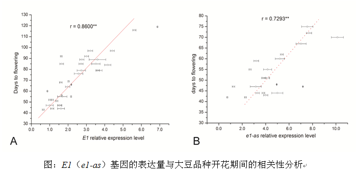 大豆分子育種重點實驗室在成功地完成了大豆生育期基因E1、E2、E3及E4基因克隆的基礎上,選擇了180個具有代表性的大豆品種,同時在全國主要大豆生態(tài)區(qū)的六個試點對大豆的開花期(R1)與成熟期(R7或R8)進行了表型觀察,對四個主要生育期基因進行了基因型鑒定,其中E1、E2、E3與E4基因的隱性基因型比率分別為38.34%、84.45%、36.33%和7.20%。將我國大豆品種劃分為8個基因型類型,e1-nf、e1-asE4、E1-asE3E4、e1-asE2(E3)E4、E1、E1E4(E3)、E1E3E4和E1E2E3E4,其中E1E3E4為優(yōu)勢基因型,占26.1%,e1-nf型(E1功能缺失型)開花最早,而E1E2E3E4 基因型開花最晚。并且在研究中發(fā)現(xiàn)不同品種中E1基因的表達量與大豆開花期呈極顯著相關,說明大豆許多已知或未知的開花位點可能通過調(diào)控E1基因來控制開花的。本研究為進行深入研究大豆調(diào)控開花的基因網(wǎng)絡及開展分子育種提供重要基礎資料。