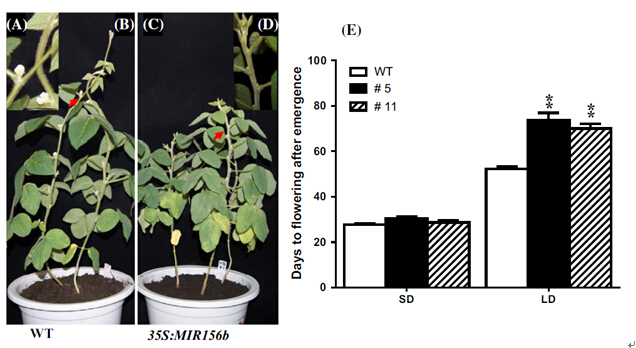 中科院大豆分子設計育種重點實驗室在microRNA172/GmTOE4a途徑(Plant Mol Biol,2015)之后,又發(fā)現(xiàn)了miR156/GmSPL途徑,在大豆光周期開花方面取得了重要研究進展。