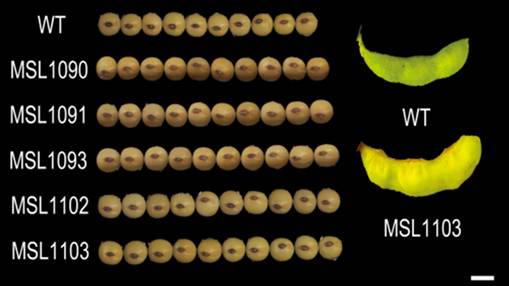 WT:為野生型大豆 MSL1090、MSL1091、MSL1092、MSL1102和MSL1103為過量表達GmCYP78A72基因的不同株系
