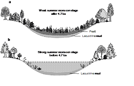 針對這一科學問題,我所濕地演化與生態(tài)功能學科組以三江平原天然沼澤濕地為研究對象,進行了系統(tǒng)的野外調(diào)查、泥炭柱芯采集和實驗分析,并收集整理分析了已有資料。在此基礎上利用頻率統(tǒng)計方法確定了三江平原泥炭地發(fā)育的歷史過程。研究結果表明,盡管三江平原泥炭地的發(fā)育時期涵蓋了整個全新世,然而80%的沼澤濕地發(fā)育于4600 yrBP之后的全新世中晚期。根據(jù)沉積相的變化發(fā)現(xiàn)該地區(qū)沼澤濕地的大多是在淺湖消亡的基礎上發(fā)育而來的。已有的研究表明,三江平原氣候?qū)贃|亞季風控制的典型溫帶季風氣候,早中全新世是夏季風相對強盛的季風最大期,而4600 yrBP 恰處于東亞夏季風衰退的關鍵期。因此,通過綜合對比泥炭地發(fā)育頻率變化和東亞季風演化的規(guī)律,該研究認為三江平原泥炭地的發(fā)育主要受控于東亞夏季風強度的變化。在早中全新世東亞夏季風最大期,強盛的夏季風帶來充足的降水,使三江平原低洼地貌區(qū)域形成水位較深的淺湖環(huán)境。而4600 yrBP以后,隨著夏季風的減弱,早期的湖泊開始逐漸消亡,沼澤濕地在此基礎上開始發(fā)育。