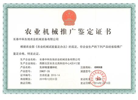 2BMZF-2Q型兩行免耕精量播種機推廣鑒定證書