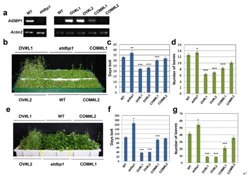 圖1. AtDBP1過表達(dá)植株與敲除的突變體的開花表型調(diào)查