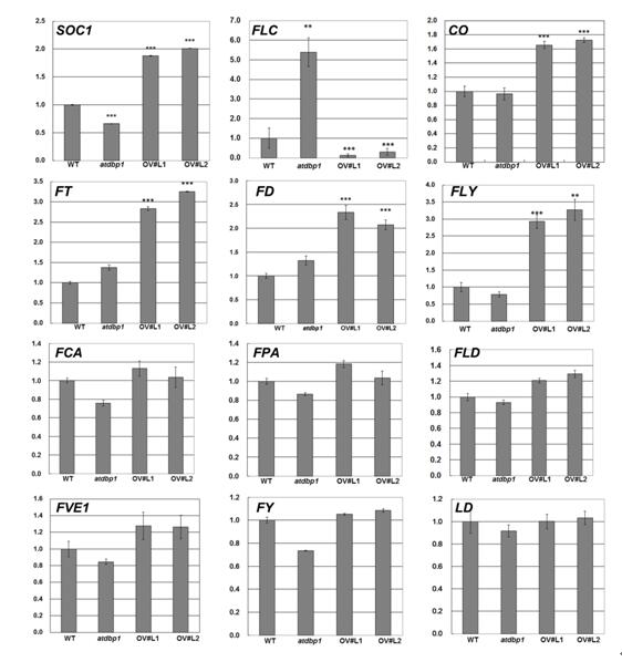 圖2. 開花途徑節(jié)點基因在AtDBP1過表達(dá)植株與敲除的突變體中的表達(dá)分析