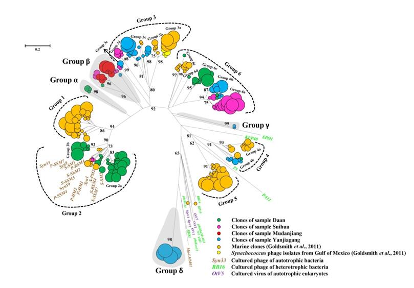 圖:稻田藍藻病毒phoH基因序列與來自海洋環(huán)境phoH基因克隆序列,來自聚球藻噬菌體、可培養(yǎng)的自養(yǎng)細菌噬菌體、異養(yǎng)細菌噬菌體、自養(yǎng)真核生物病毒的phoH基因序列構建的系統(tǒng)進化樹
