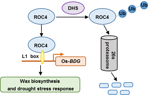 進(jìn)一步研究發(fā)現(xiàn),DHS具有E3泛素連接酶活性,能夠與HD-ZIP Ⅳ家族轉(zhuǎn)錄因子ROC4相互作用,分析ROC4過量表達(dá)植株和基因敲除突變體,發(fā)現(xiàn)ROC4正調(diào)控水稻表皮蠟質(zhì)合成和干旱脅迫反應(yīng);ROC4體內(nèi)蛋白具有泛素化形式,并受泛素/26蛋白酶體(UPS)途徑介導(dǎo)降解;DHS促進(jìn)ROC4降解,而dhs突變減緩ROC4降解;遺傳學(xué)分析表明,ROC4作用于DHS下游;DHS-ROC4直接調(diào)控下游靶基因Os-BDG的表達(dá)。