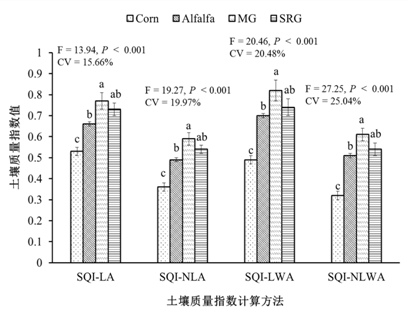 進(jìn)一步的研究表明,松嫩堿化草地土壤質(zhì)量評價的最小數(shù)據(jù)集中包括蔗糖酶活性、N:P、可溶性有機(jī)碳含量和不穩(wěn)定有機(jī)碳含量 4個土壤指標(biāo)。4個土壤質(zhì)量指數(shù)均能準(zhǔn)確的反應(yīng)出土地利用方式對土壤質(zhì)量的影響,但由于SQI-NLWA在不同土地利用方式間的差異更明顯,變異性更大,能更敏感的反映出土地管理措施的影響,因此更適合研究區(qū)內(nèi)土壤質(zhì)量的評價。苜蓿地、羊草地和自然恢復(fù)草地中土壤質(zhì)量指數(shù)均較高,表明草地恢復(fù)顯著改善了研究區(qū)內(nèi)的土壤質(zhì)量。