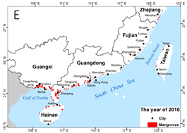 紅樹林是生長在熱帶、亞熱帶海岸潮間帶或河流入海口的木本植物群落,具有防風消浪、保護灘涂、凈化海水和促淤造陸等重要作用,是國際上濕地生態保育和生物多樣性保護的重要對象。然而近半個世紀以來,人類活動和自然環境的變化導致紅樹林資源急劇減少,全球35%的紅樹林在此期間消失。紅樹林不可取代的生態、經濟、社會效益,以及面臨著自然和人為雙重脅迫下急劇銳減的嚴峻形勢,使得紅樹林保護和管理越來越受到世界各國的重視。在中國,上世紀后50年紅樹林遭到嚴重破壞,其損失速率顯著高于世界平均水平。自20世紀90年代中期開始,中國政府頒布了一系列紅樹林保護的法律和條例,但是關于紅樹林保護成效的研究甚少。特別是在國家尺度上,紅樹林保護的成效如何?各個保護區的建立是否起到了保護當地紅樹林的作用?等等相關問題還沒有明確的答案。這些問題的解答對于制定合理的濱海濕地保護、恢復和資源利用政策意義重大,對于建設“美麗中國”這一生態文明目標的相關工作也具有重要的借鑒意義。