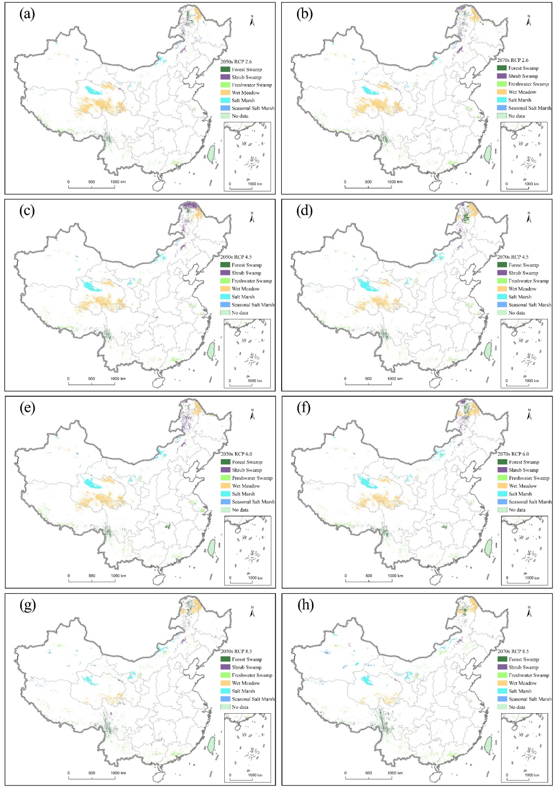 預(yù)測結(jié)果表明,未來全球增溫將進(jìn)一步威脅現(xiàn)存自然濕地,高海拔山地和內(nèi)陸干旱半干旱地區(qū)的濕地生態(tài)系統(tǒng),將面臨更快速的退化風(fēng)險(xiǎn)。在各類型濕地中,淡水沼澤和季節(jié)性鹽沼面臨的風(fēng)險(xiǎn)更高。期刊審稿專家和主編評(píng)價(jià)認(rèn)為該成果為認(rèn)識(shí)歷史濕地分布格局,科學(xué)合理指導(dǎo)現(xiàn)實(shí)濕地恢復(fù)提供了依據(jù);同時(shí),認(rèn)為本研究填補(bǔ)了中國濕地研究缺少地質(zhì)歷史時(shí)期全國尺度分布圖的空白。