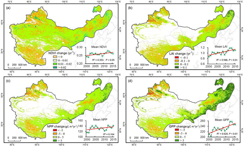 圖 中國(guó)干旱-半干旱區(qū)主要生態(tài)系統(tǒng)參量年際變化趨勢(shì)