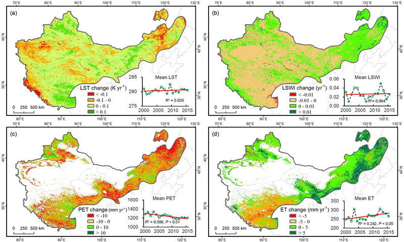 圖 中國(guó)干旱-半干旱區(qū)主要環(huán)境參量年際變化趨勢(shì)