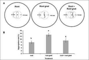 圖2 EPN對寄主韭蛆和寄主棲境韭菜根單獨及其互作的集聚反應