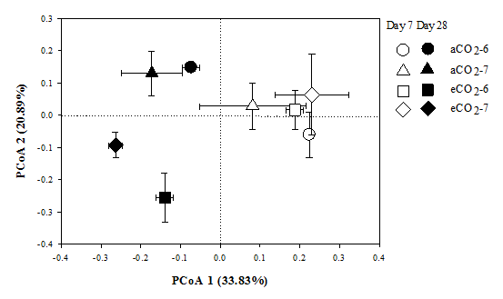 圖2正常CO2濃度(○)和CO2濃度升高(△)條件下大豆殘體在培養7天、14天、28天后土壤整體細菌群落結構PCoA圖。